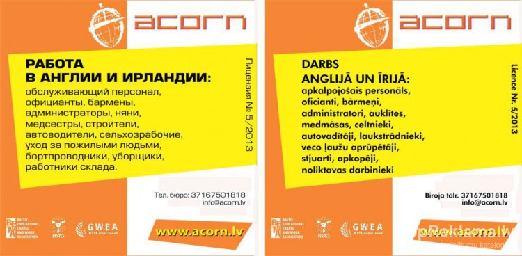 Darba vakances ārzemēs dažādās sfērās atkarībā no angļu valodas zināšanu līmeņa un darba pieredzes. Darba meklētājiem bez angļu valodas zināšanām tiek piedāvāts darbs: