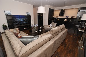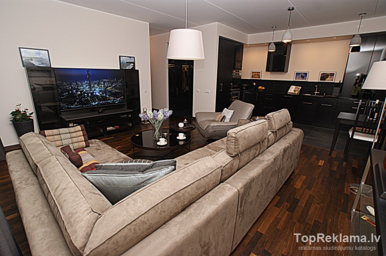 Viesistabā: koka parketa grīda, eko kamīns, platekrāna tv, labas kvalitātes ērts dīvāns, atpūtas krēsls, 2 gb stikla galdi (ar papildus funkciju). Interjera aksesuāri.