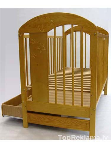 Продам детскую кроватку Klups Radek VII (с ящиком), светлого цвета. Изготовлена из соснового дерева. На быльцах кроватки резные украшения луна и звезды. Кровать имеет 2 съемные перекладины. Есть возможность менять высоту матраца по мере взросления ребёнка - 3 положения. Выдвижной ящик для белья. Очень легко складывается. Размеры 120 см / 60 см.