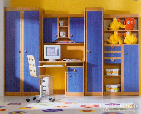 Pārdod mēbeles bērnu istabai (4 daļas): drēbju skapi, skapi ar plauktiem, grāmatu plauktu un rakstāmgaldu ar plauktu (sk. foto). Uz foto kopā, istabā var izvietot atsevišķi. Gaiša koka krāsā, durvis zilas. Pārdodam, jo bērns ir izaudzis. Ļoti labā stāvoklī. Skaisti durvju rokturi, dažādu jūras dzīvnieku formā.