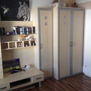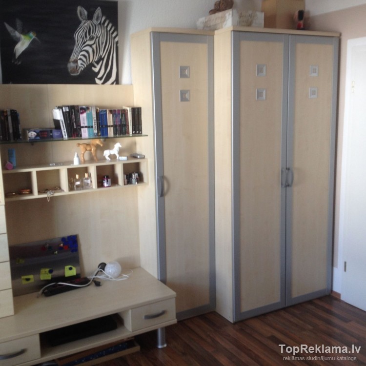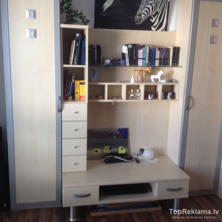 Skapja izmēri ir 100cm plats 60 cm dziļš. skapis kas ir blakus tv galdiņam ir 50 cm plats un 35 cm dziļš. tv galdiņš ir 125 cm plats. visa sekcija ir apmēram 325 cm plata. un ir divi grāmatu plaukti 30x30 cm un aptuveni 215cm gari. Šobrīd viss ir izjauktā veidā.
