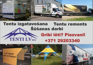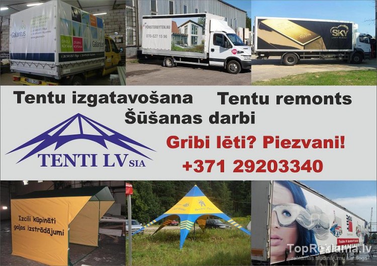 Veicam šūšanas darbus un remontus. Piedāvājam arī lielfomāta druku un reklāmas uzkrāsošanu uz dažādiem tentiem, nojumēm un auto.