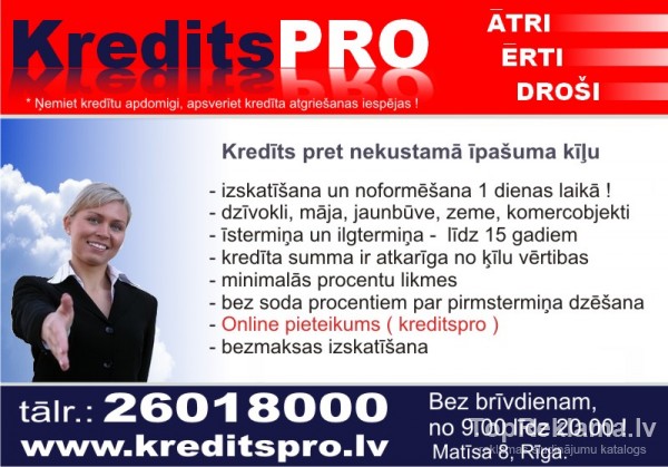 Кredīti pret nekustamā īpašuma ķīlu - 1 dienas. - 0% soda naudas par pirmstermiņa dzešanu