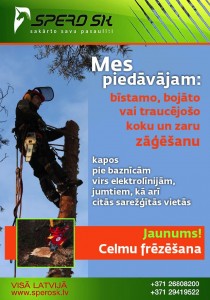 SIA SPERO SK piedāvā: bīstamo koku novākšana kapos, pie baznīcām, elektrolīnijām, privātmājām utt., celmu frēzēšana (mūsu rīcībā celmu frēze Laski F-450H), autopacēlāja pakalpojumi, kā arī visa veida darbi augstuma.