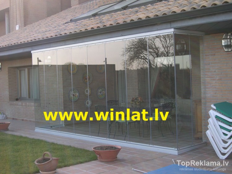 Bīdamas, bezrāmju, lodžijas, balkoni, terases.