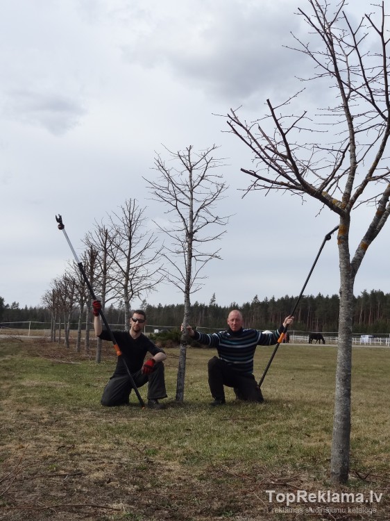 Zāles pļaušana, jumtu tīrīšana no gružiem, teritoriju uzkopšana. Koku zāģēšana, bīstamo koku zāģēšana ar klasisko zāģēšanu, alpīnismu, arborismu un pacēlāju visa veida situācijās.