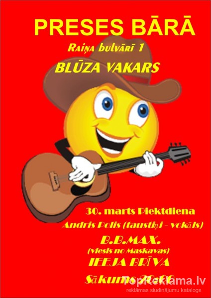| Laipni aicināti uz blūza vakaru "Preses bārā" Raiņa bulvŗī 1. Uzstāsies B.B.MAX. viesis no Maskavas. Sākums 20:00, ieeja brīva. |