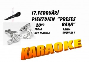 | Visi kam patīk KARAOKE - laipni aicināti 17. februārī pl. 20:00 "Preses bārā" Raiņa bulvārī 1. Jautrs vakars garantēts. |