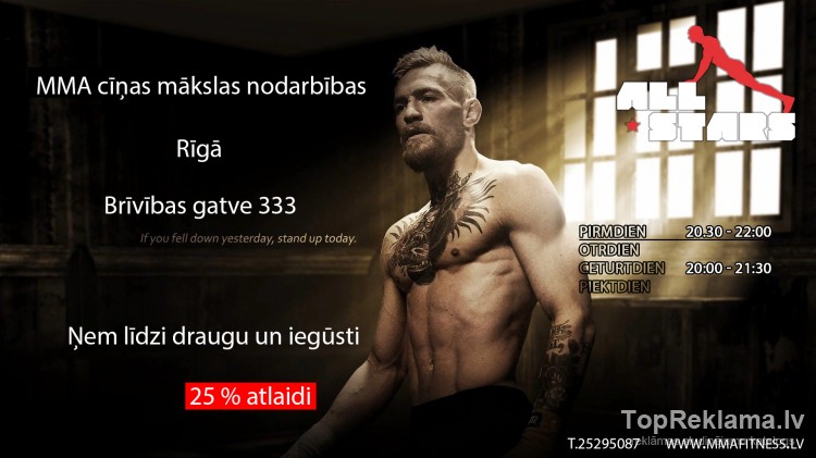 Nodarbības notiek Otrdienās, Ceturtdienās, Piektdienās plkst. 20.00 – 21. 30, MMA ieķļauj tādu cīņas tehniku kā graplings, džiudžitsi, combat Sambo, kudo, bokss, kikbokss u. c – sitieni, metieni, žņaugšanas un sāpju paņēmieni, cīņa uz zemes un stājā, kā arī iegūsi labu fizisko sagatavotību. Aicināti ir visi interesenti sākot no 10 - 55 gadu vecuma. Kā treneri tā arī sportisti ir atsaucīgi sporta klubā kā arī individuāla pieeja un uz visiem interesējošiem jautājumiem atbildam un palīdzēsim vienmēr.