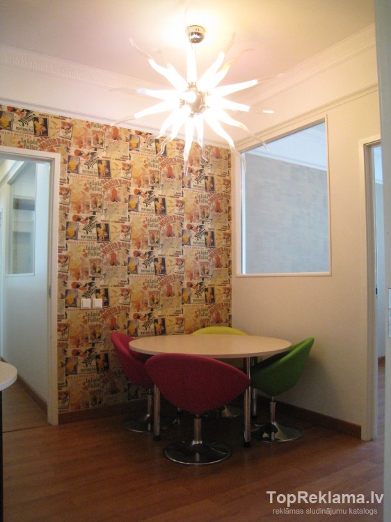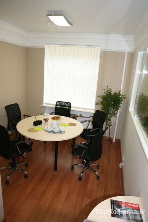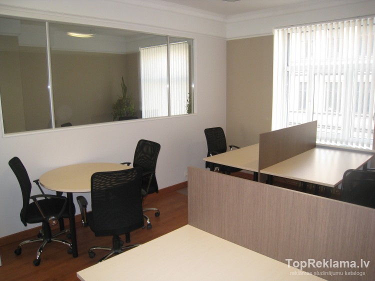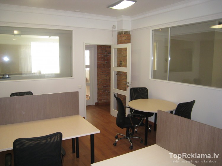 Mēbelēta telpa birojam 18 m2 – 4 līdz 5 darba vietas + 42m2 palīgtelpas: divas WC, pārrunu telpa, ofisa kafe.