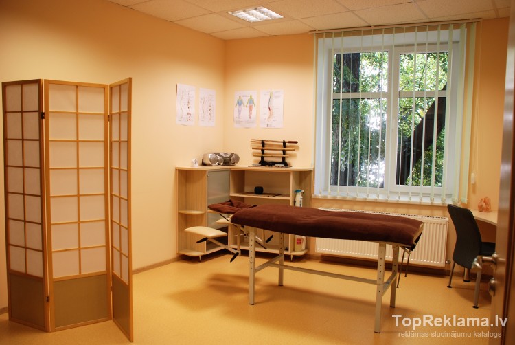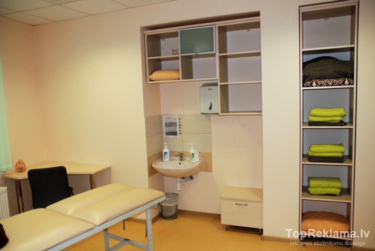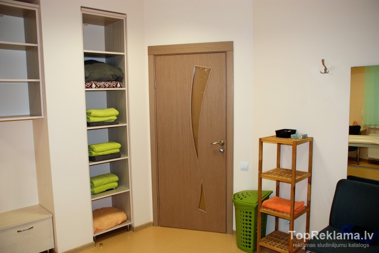 Kušete, galds, krēsli, aizslietnis, moderna duškabīne, dvieļi, dezinfekcijas līdzekļi un citi izejmateriāli, mūzikas centrs.