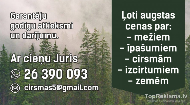 Līdz 20000Eur/ha. Maksimāli augstas cenas Visā Latvijā par Mežu īpašumiem un Cirsmām uz izstrādi, Latvijas Uzņēmums Pērkam: neizstrādātus, daļēji izstrādātus un izstrādātus meža īpašumus un cirsmas, lauksaimniecības zemes ar mežu.