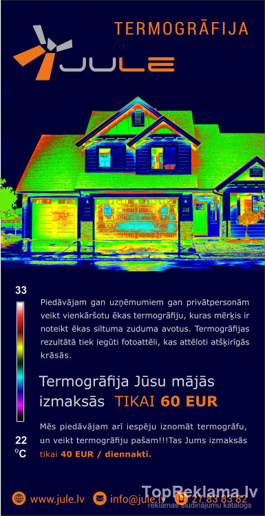 Piedāvājam gan uzņēmumiem, gan privātpersonām veikt vienkāršotu ēkas termogrāfiju, kuras mērķis ir noteikt ēkas siltuma zuduma avotus. Termogrāfijas rezultātā tiek iegūti fotoattēli, kas attēloti atšķirīgās krāsās.Termogrāfija Jūsu mājās izmaksās TIKAI 60 EUR