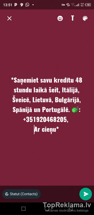 Lai izceltu šo sludinājumu portālā TopReklama.lv, nosūtiet SMS kodu uz tālruni 1881