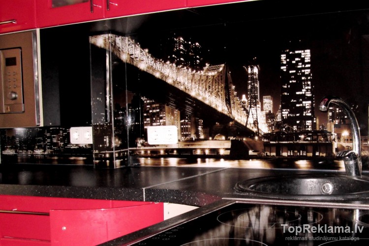 Virtuves sienas paneļu izgatavošana- ar attēliem pēc Jūsu izvēles!. Uzmērām, izgatavojam un uzstādām, hermetizējam pa perimetru un stūros. Iespējams aplikt ar materiālu komunikācijas caurules (kā attēlā veikts), arī uzstādīt uz nelīdzenām sienām.
