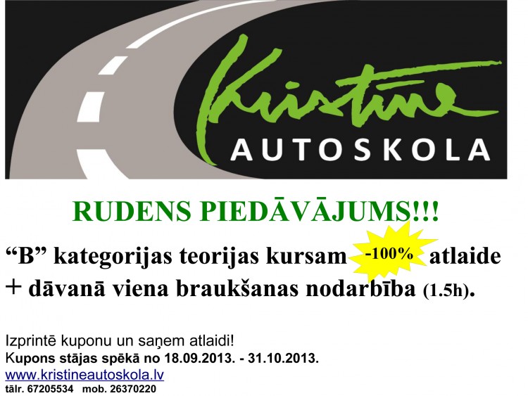 1) Izprintē kuponu un saņem atlaidi "B" kategorijas teorijas kursam.