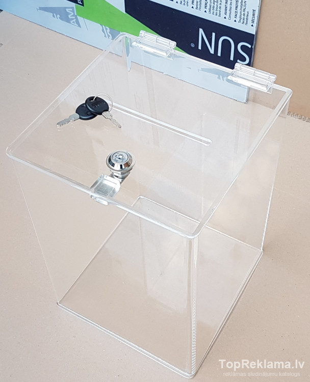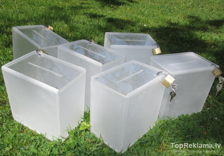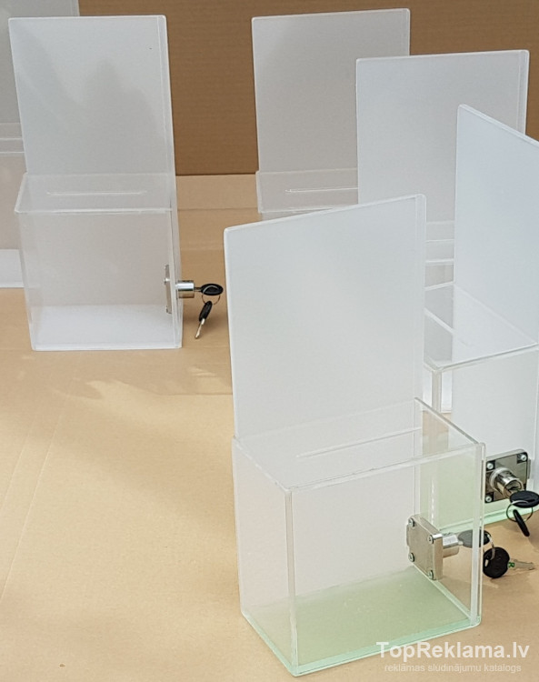 Ziedojumu, atsauksmju, aptauju kastītes. Slēdzamas ar iebūvētu atslēgu. Vai ar nelielām hromētām piekaramām atslēgām. Drošībai pieskrūvējamas caur iekšpusi ar 4 skrūvēm savā vietā uz galda vai pie sienas. Lielums parasti 150 mm – 220 mm augstas, var 300mm, ar displejiem maināmai informācijai A5 līdz A4 formātam. Vai pēc Jūsu zīmējuma. Vairāk informācijas- par variantiem, vajadzīgajiem izmēriem, apdari, skaitu, termiņiem- PM. Ar cieņu DEKOSTIKLS "Dekoratīvie elementi, vitrīnas, galda aksesuāri, konteineri elektronikai un automātikai" Rīga - Jūrmala – Latvija.