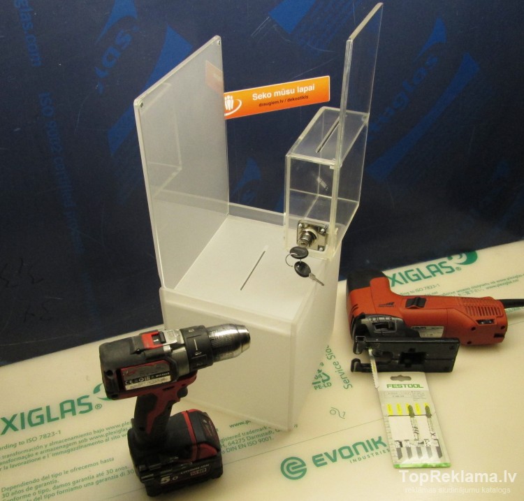 ZIEDOJUMU KASTĪTES un ATSAUKSMJU / APTAUJAS ANKETU un vizītkaršu KASTĪTES – Slēdzamas ar iebūvētu GTV atslēgu. Vai ar atverēm mazai piekaramai „Gerda” / ASSA/ „ABLOY” atslēgai. Drošībai var būt pieskrūvējamas caur iekšpusi ar 4 skrūvēm savā vietā uz galda vai pie sienas. Izgatavošana arī pēc pasūtījuma pēc nepieciešamā izmēra. Lielums parasti 150 mm – 220 mm augstas, var ar displejiem maināmai informācijai A5 līdz A4 formātam. Kopējais augstums parasti līdz 600 mm. Cenas ir ļoti dažādas. Vairāk info- par variantiem, salaidumiem, apdari, termiņiem- rakstot uz darba e- pastu: info@dekostikls.lv. Ar cieņu DEKOSTIKLS "Dekoratīvie elementi, vitrīnas, galda aksesuāri, konteineri elektronikai un automātikai" Rīga - Jūrmala – Latvija