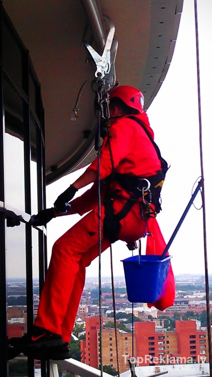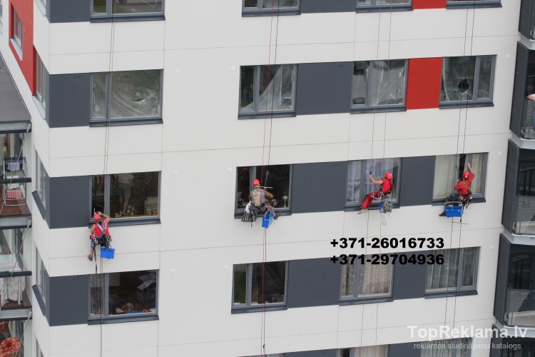 Logu mazgāšana grūti pieejamās vietās , izmantojot industriālo alpīnistu metodes.