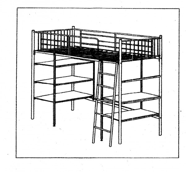 Metāla gulta sudraba krāsā. Matrača izm. 90*200 cm (neietilpst piedāvājumā). Apakšējā stāvā-galda virsma un 3 plauktiņi. Attālums no grīdas līdz gultas pamatnei apm.150 cm. Lielisks risinājums nelielām telpām.