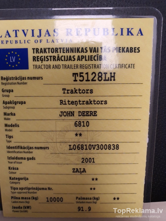 Pārdod traktoru John Deere 6810, Izlaiduma gads: 2001 g.,