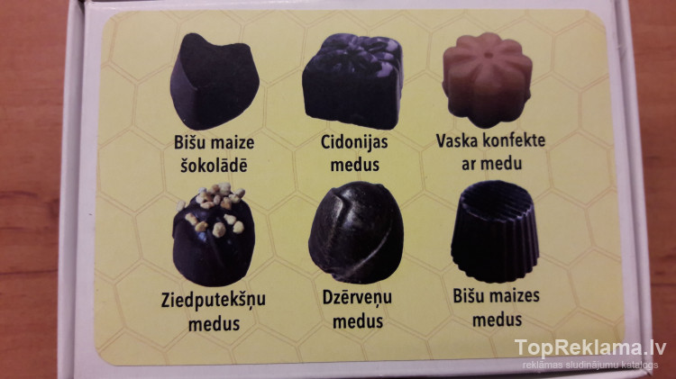 Bildēs ir standarta kastītes ko šobrīd gatavojam. Pastāv iespēja pamainīt dizainu, konfekšu veidu iepakojumā, piemēram, visas konfektes ar bišu maizes pildījumu, kā arī varam piepildīt Jūsu izvēlēto iepakojumu.