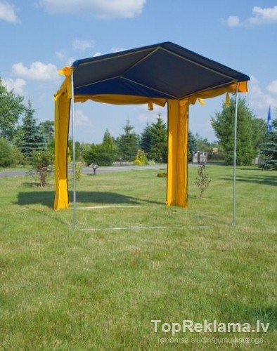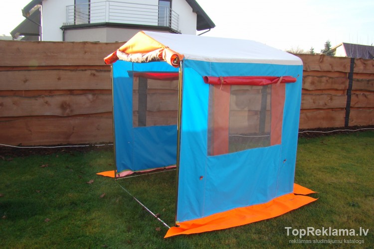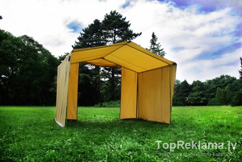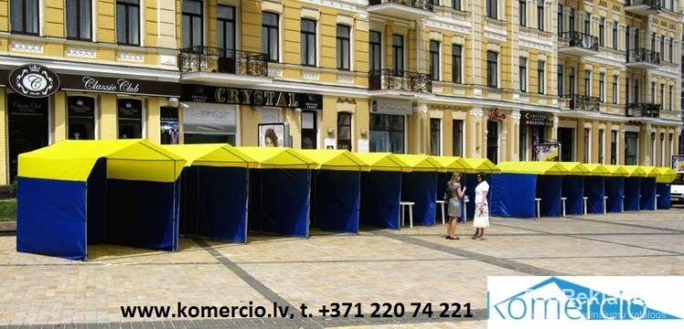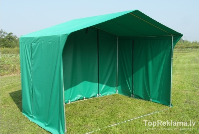 Piedāvājam stiprinātā metāla teltis/nojumes - cenā ietilpst: telts rāmis, 3 sienas un jumts. (pagarināts 50 cm - lietus laikā ērti, jo netiek bojāta prece un arī klientiem ērti iepirkties)