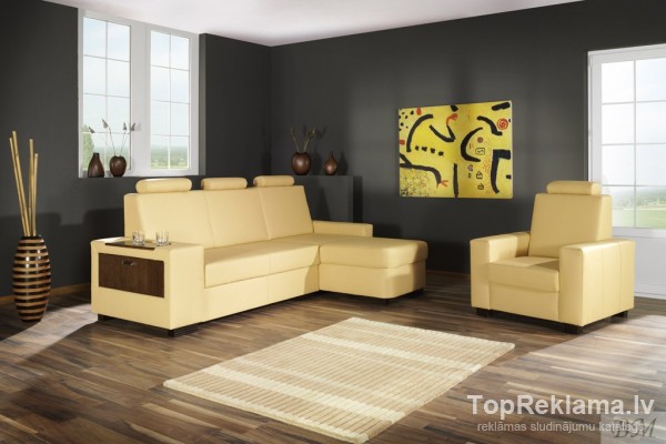 Izvelkamais stūra dīvāns LIVIA no auduma, cena no ādas Ls 700. Izmēri 155x245 cm, guļamvieta 126x195 cm. Krēsls Ls 135. Izgatavojams pēc pasūtījuma. Ražotāja katalogs ir pieejams mājas lapā. Audumu izvēle iespējama mēbeļu salonā Jūrmalas gatve 123 b.