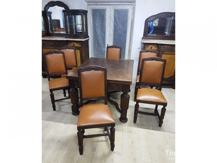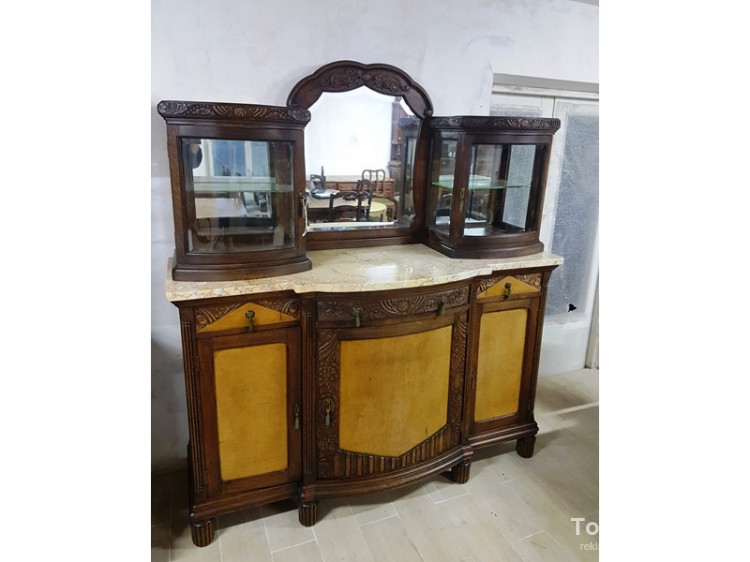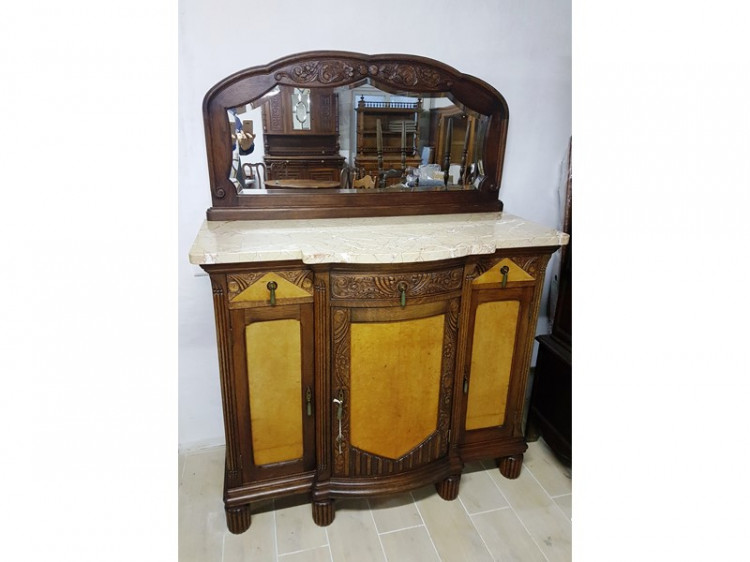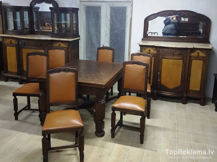 Grezns ēdamistabas komplekts ar marmoru. Izmēri:bufete 59x173cm;h-195cm. , bufete 59x129cm;h-172cm. , galds 99x130/241cm;h-75cm.