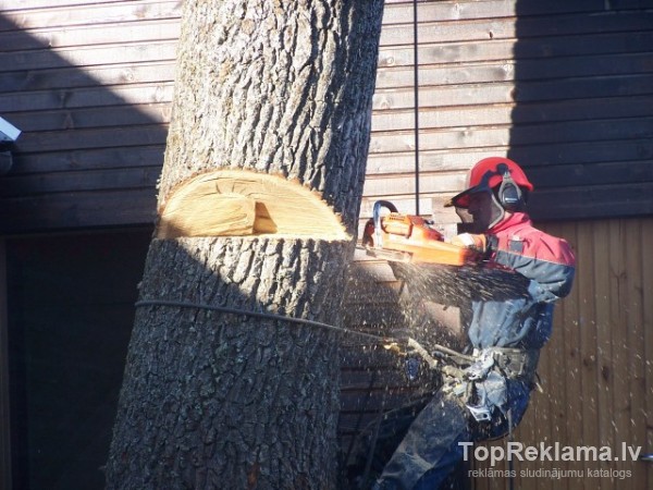 Likvidē vēja un citu faktoru nodarītos postījumus kokiem. Jumtu tīrīšana, teritoriju uzkopšana, zāles pļaušana un rūpnieciskais alpīnisms.