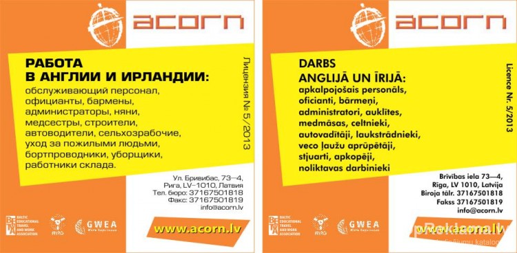 Darba vakances ārzemēs dažādās sfērās atkarībā no angļu valodas zināšanu līmeņa un darba pieredzes. Darba meklētājiem bez angļu valodas zināšanām tiek piedāvāts darbs: